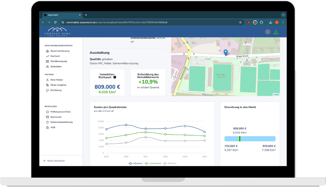 Einfache Antragstrecke mit anschließender Ausgabe eines ungefähren Richtwerts für die Immobilie- als HTML, PDF und als Leadgenerator für Ihre Website.